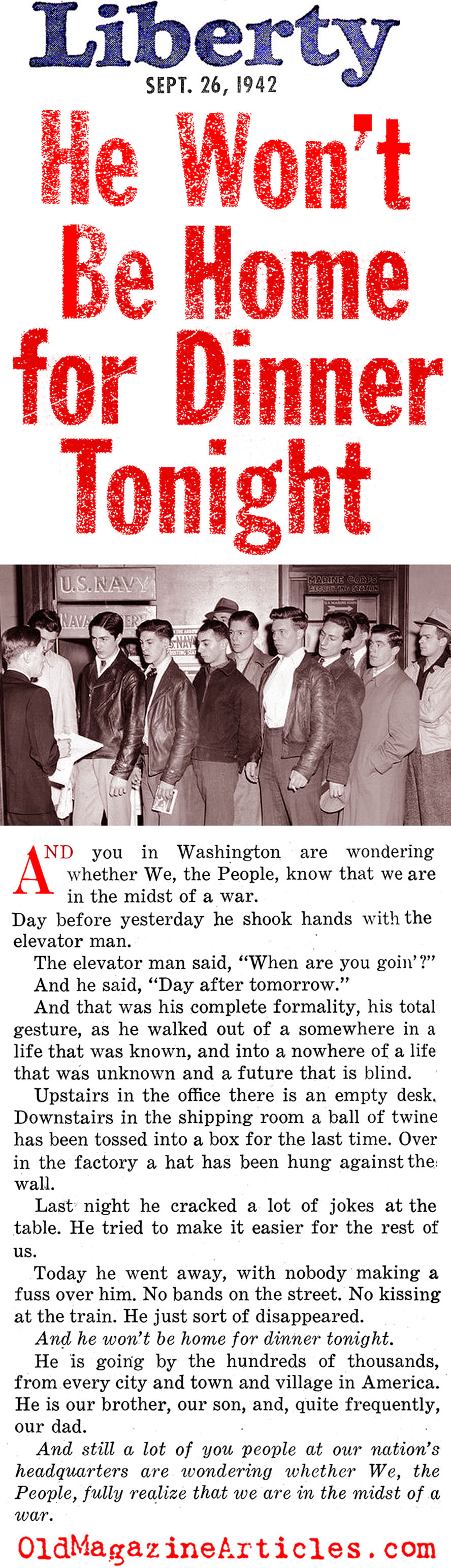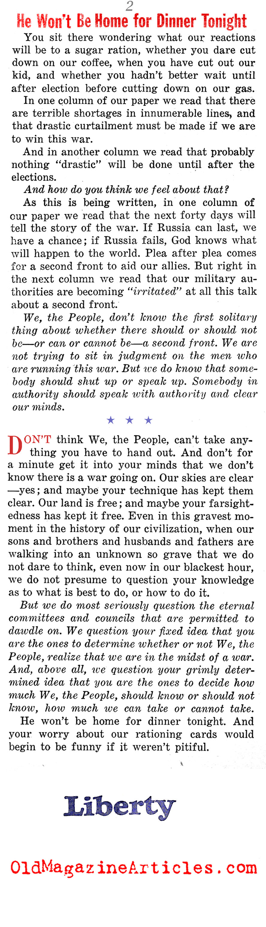 “Don’t Think that We the People, can’t take anything you have to hand out. And don’t get it into your minds that we don’t know there is a war on… He won’t be home for dinner [again] tonight. And your worry about our rationing cards would be funny if it weren’t so pitiful.”