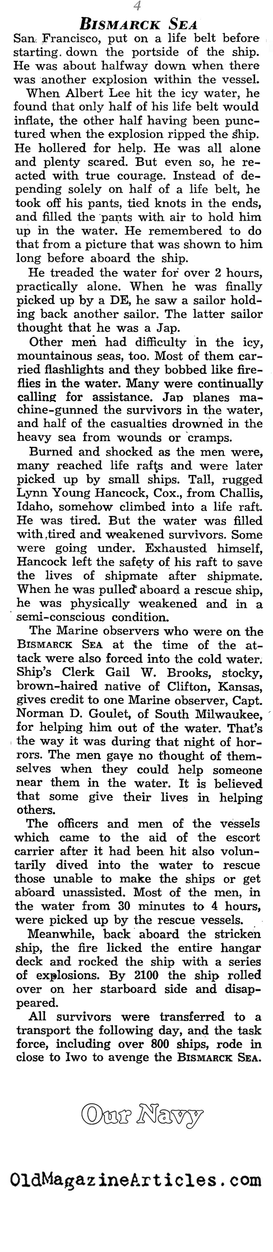 Reginald Fischer Bismark Sea 1945,Billie C Spell Bismark Sea 1945,William C Bull Bismark Sea 1945,Albert Lee radio operator Bismark Sea 1945,Lyn Young Hancock Bismark Sea 1945