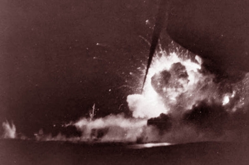 “The first bomb struck the aft hangar deck and set the elevator well on fire. The ship’s CO sped the orders along to fight the fire. The firefighting parties worked hard trying to extinguish it. To the tall, gray-haired skipper it looked as if they would succeed, but the second place snarled the works…[when] he was told that four torpedoes were knocked loose from their storage and lying the fire, and five other were on the edge of it. Immediately he ordered to abandon ship. Life rafts were cut loose. Hundreds of men adjusted their life jackets and jumped into the wind-chilled waters.”