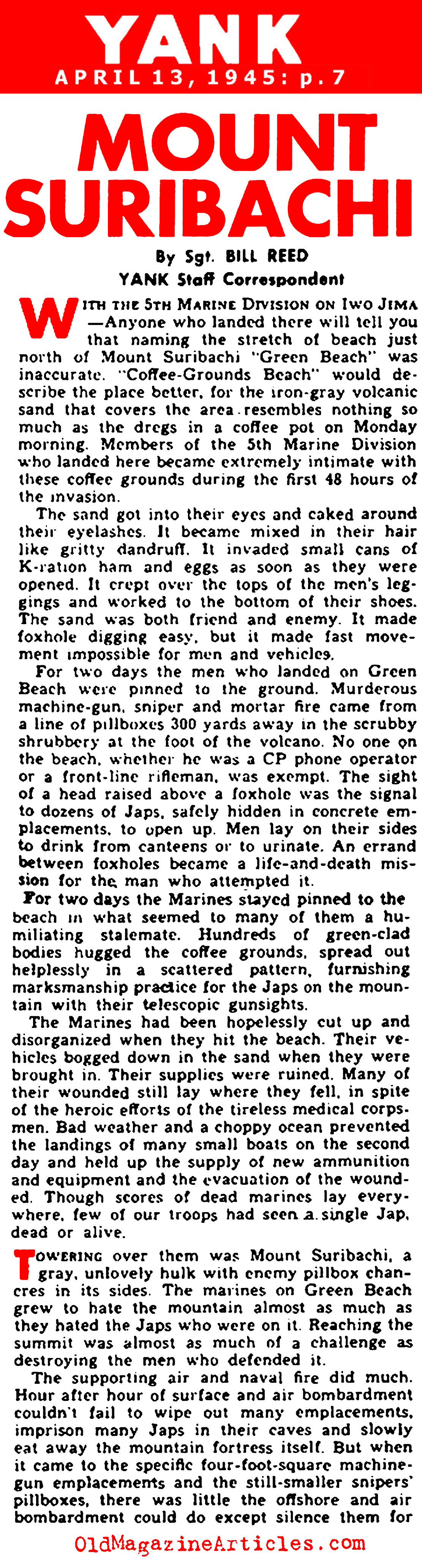 Yank Magazine reporter Bill Reed wrote the following account of the Fifth Marine Division’s Iwo Jima slug fest that occupied much of their time throughout the months on February and March, 1945: