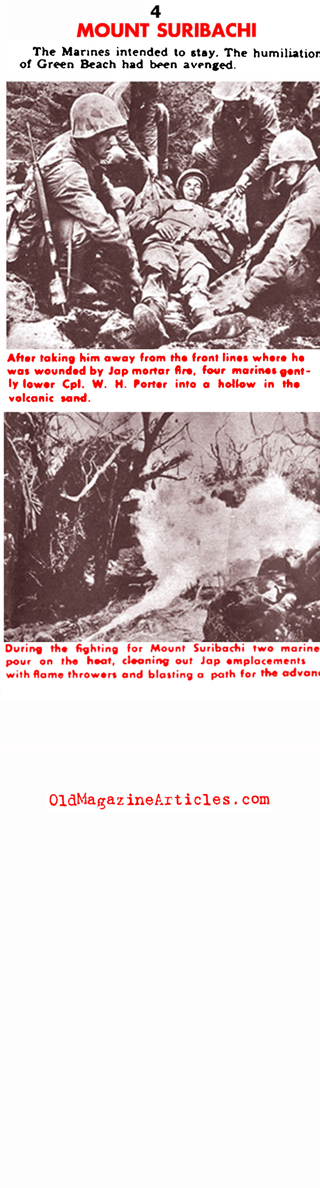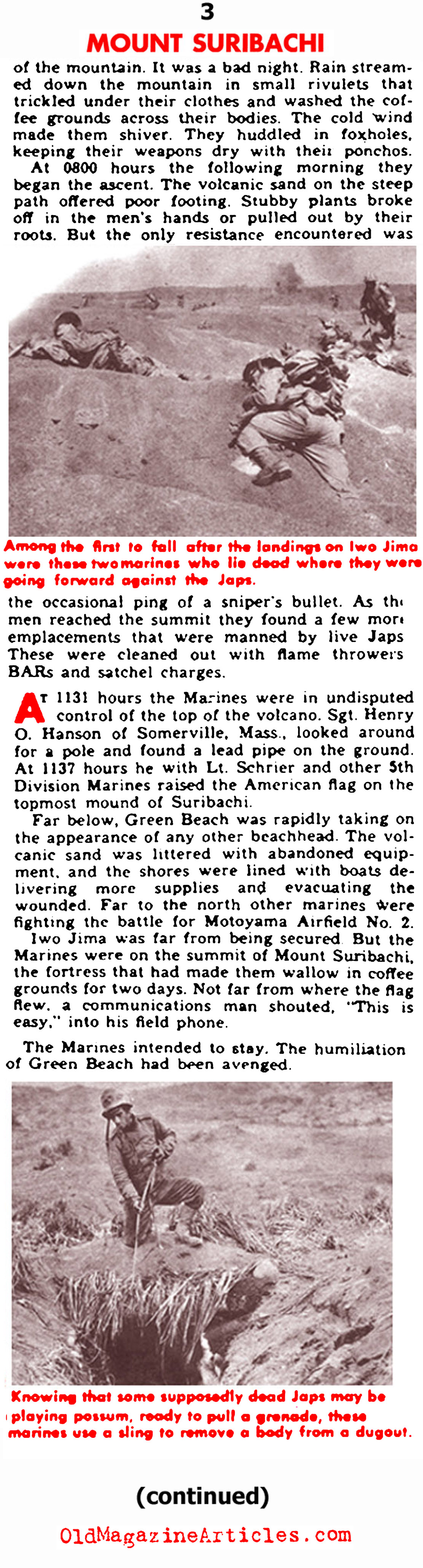 KEY WORDS: Battle for Mount Suribachi,5th Marines on Mount Suribachi,Fifth Marine Division on Mount Suribachi 1945,Yank Magazine Article Concerning Mount Suribachi,Eyewitness to First Flag Raising on Mount Suribachi 1945,Yank Magazine Account of First Flag Raising on Iwo Jima’s Mount Suribachi,Iwo Jima War Story,Mount Suribachi War Story