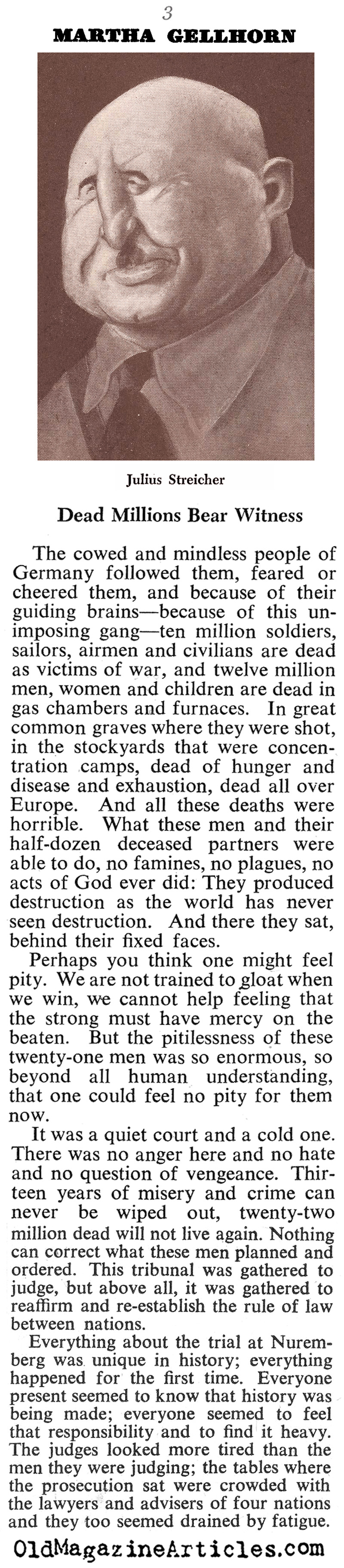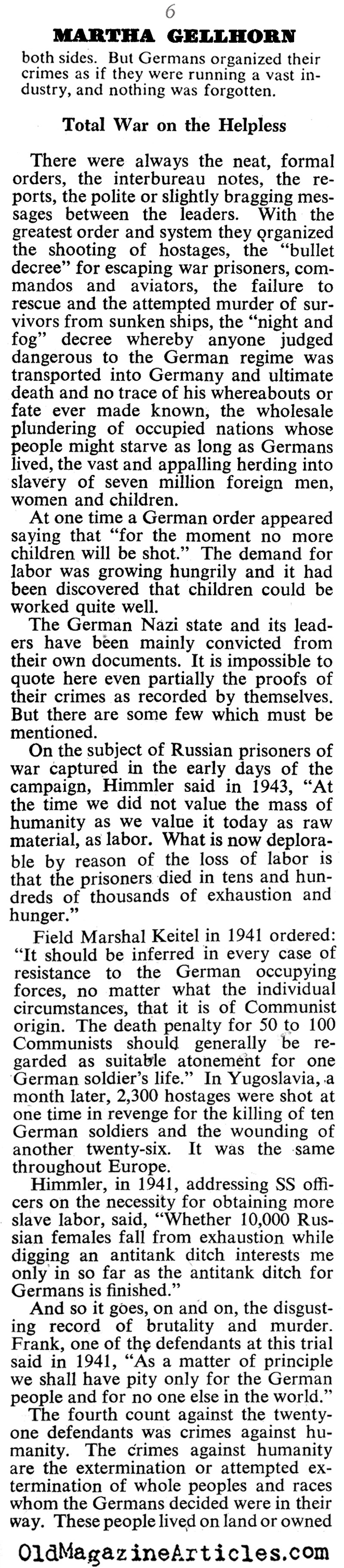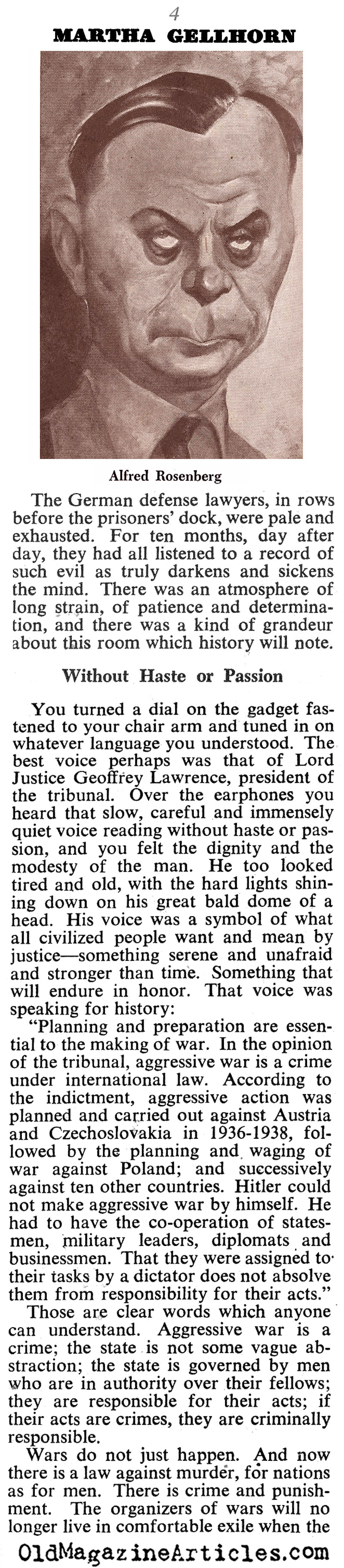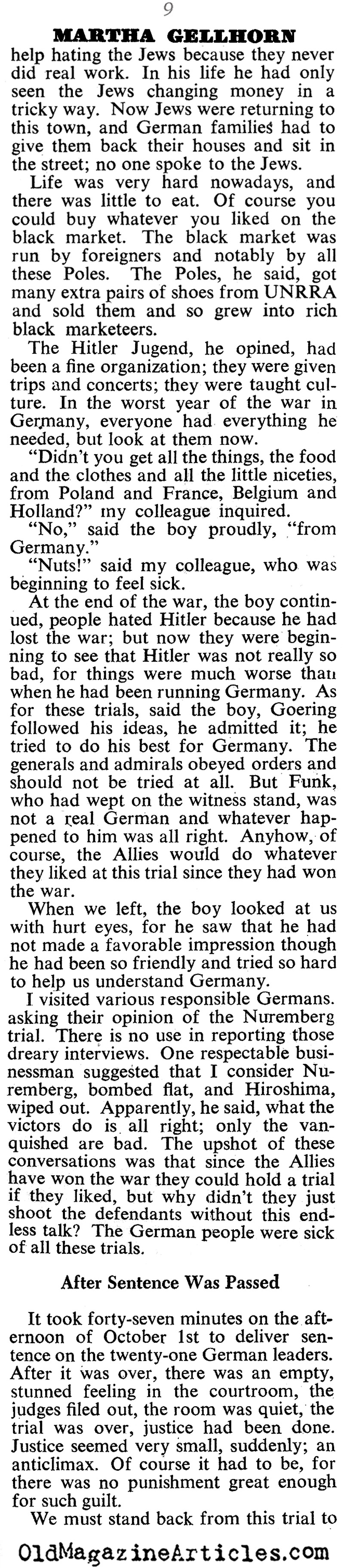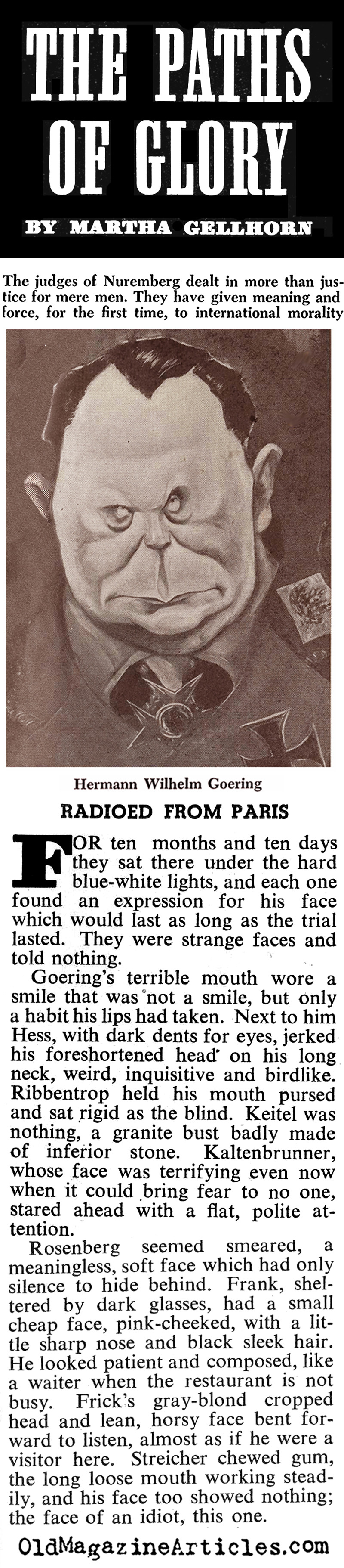 War correspondent Martha Gellhorn (1908 – 1998) filed this article concerning her observations and insights gleaned at the Nuremberg Trials:
