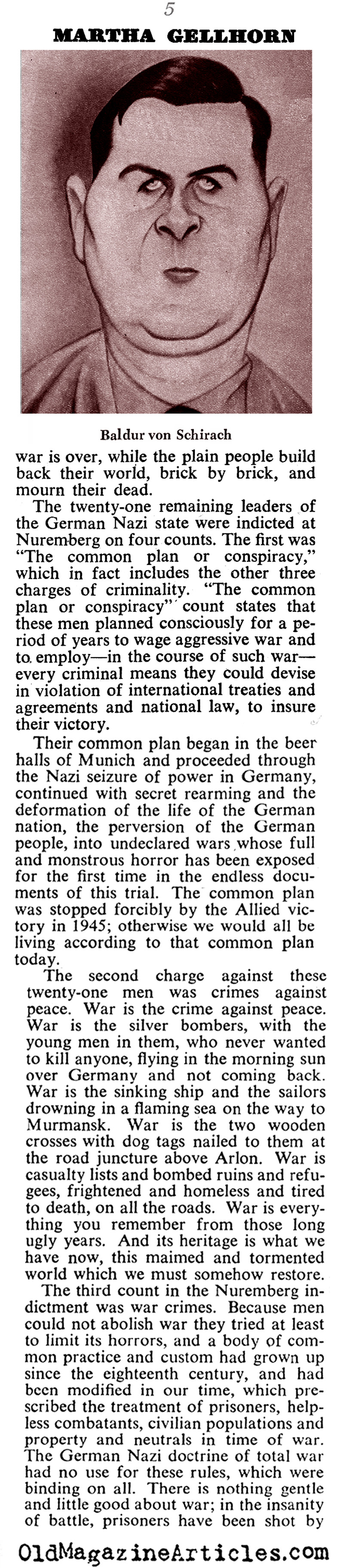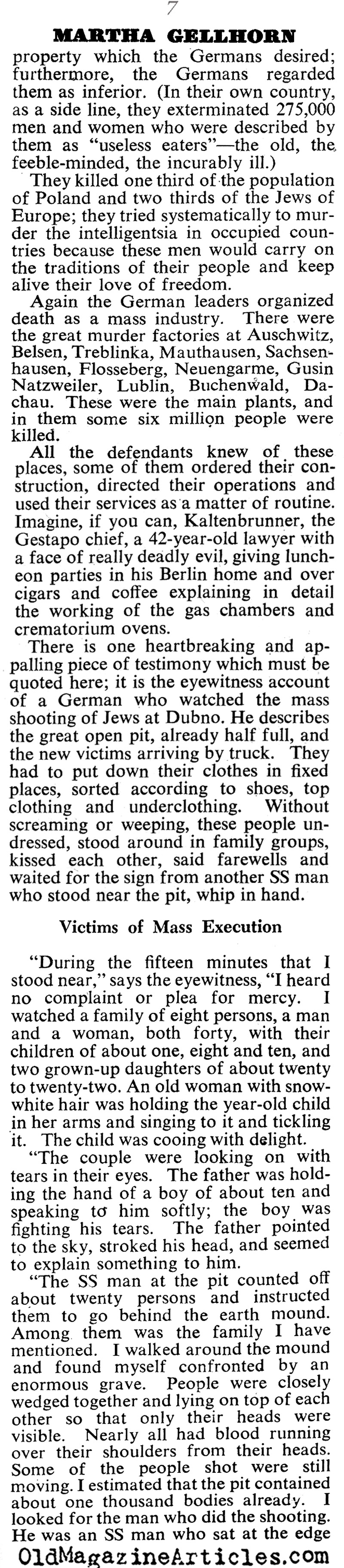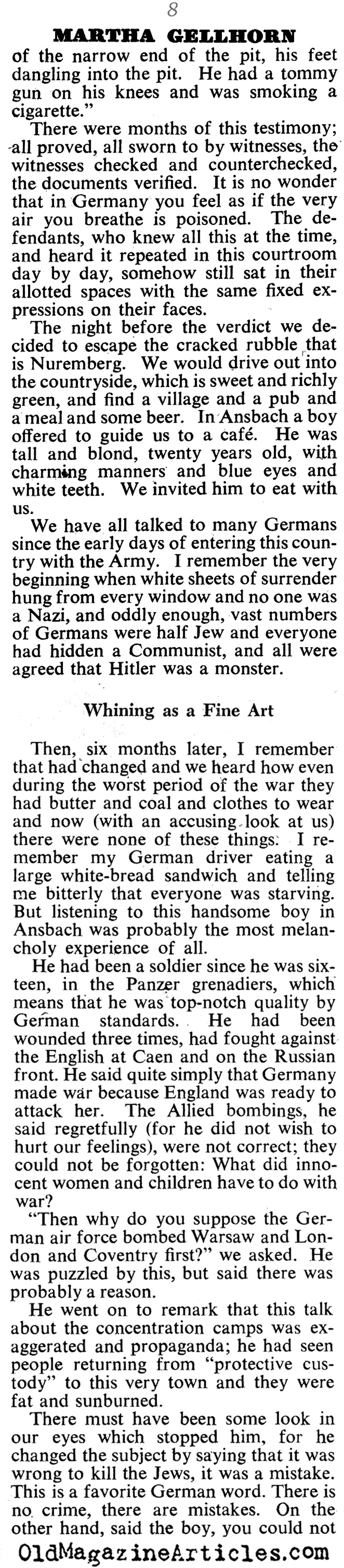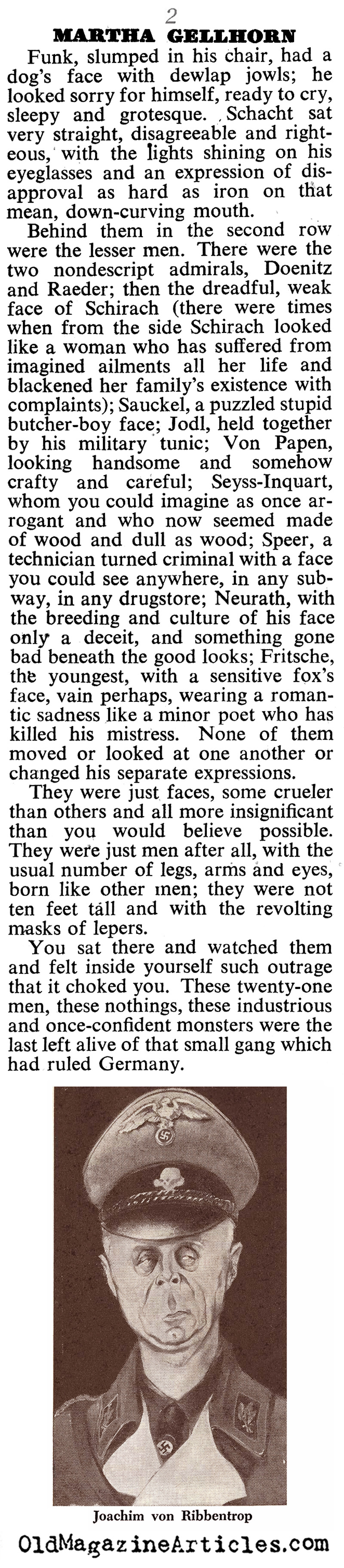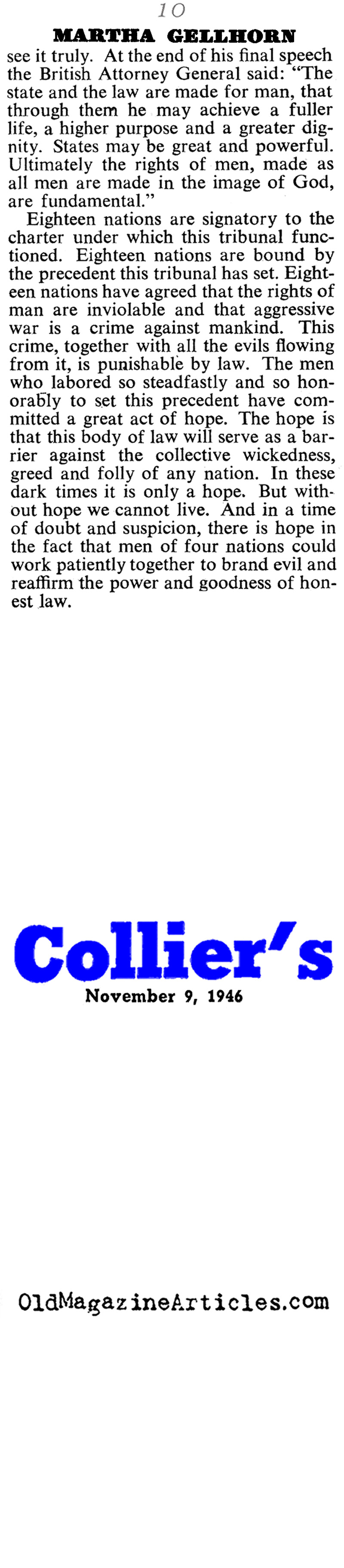 War correspondent Martha Gellhorn (1908 – 1998) filed this article concerning her observations and insights gleaned at the Nuremberg Trials: