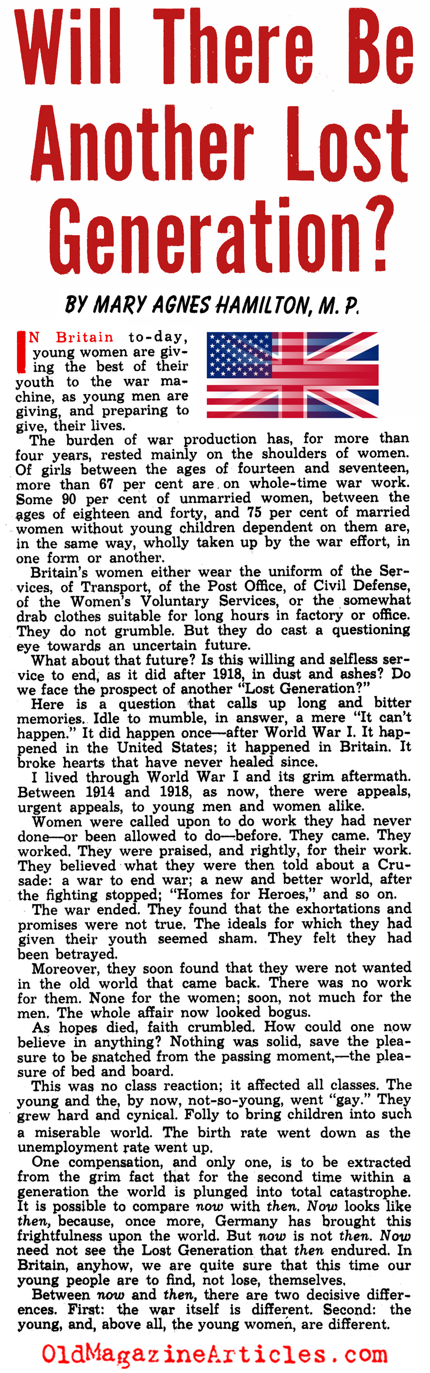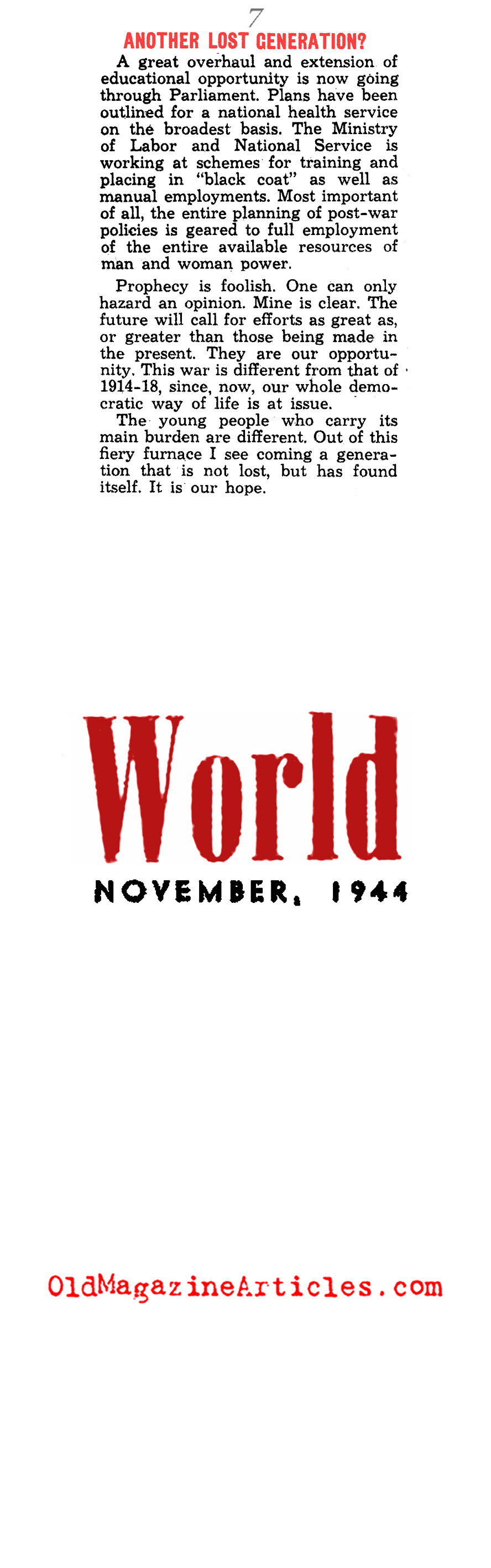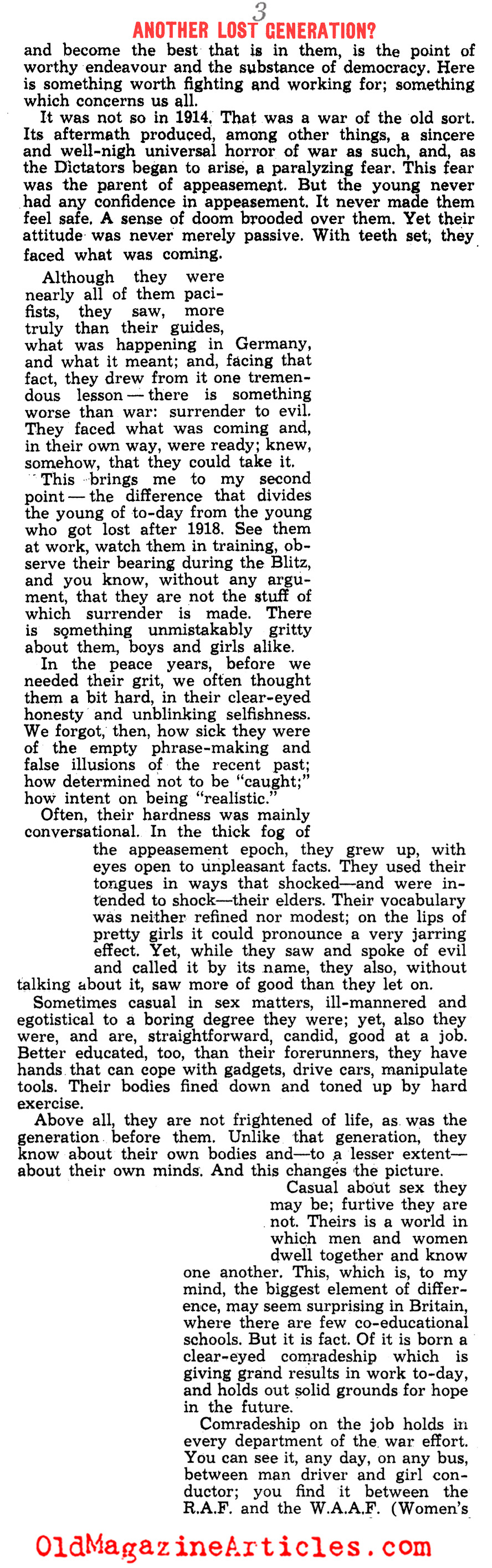 “For the second time in a generation the world is plunged into catastrophe. It is possible to compare now with then. Now looks like then because, once more, Germany has brought this frightfulness upon the world. But now is not then. Now need not see the Lost Generation that then endured. In Britain, anyhow, we are quite sure that this time our young people are to find, not lose, themselves.”