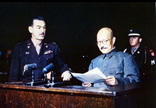 Pictured above is General Hideko Tojo on trial. Click here to of his capture.