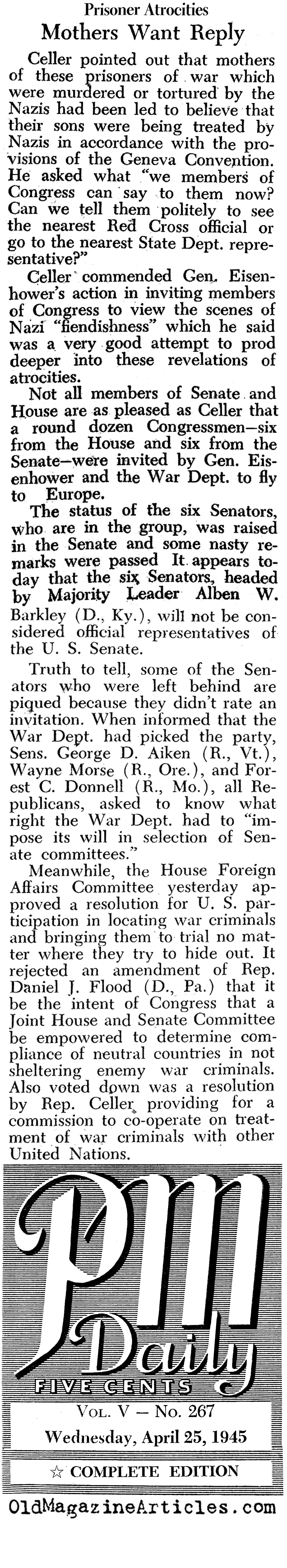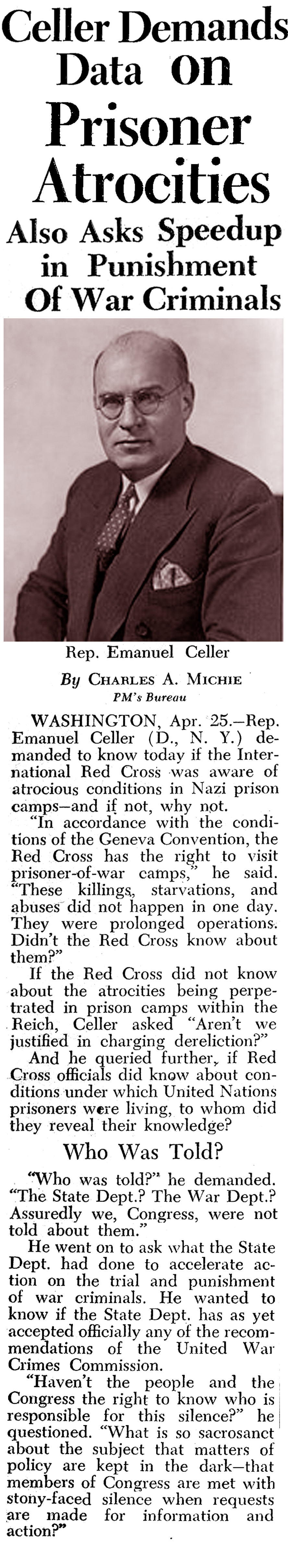 U.S. Representative Emanuel Cellar (1888 – 1981) and a number of senators were all in agreement that the International Red Cross had failed in their task to police Nazi P.O.W. camps for prisoner abuse: