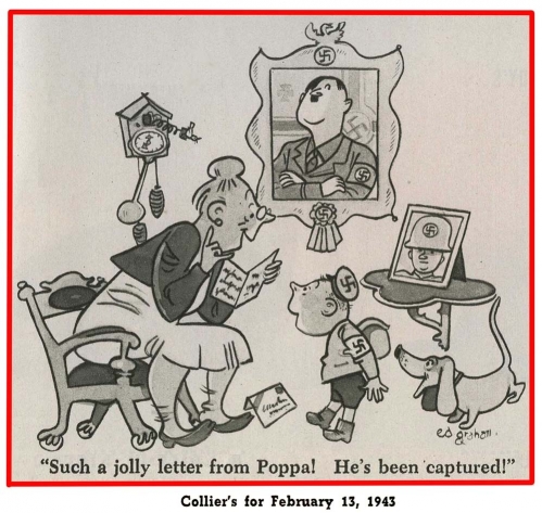 As the above cartoon implies, by 1943 the home front had learned that the captured Axis prisoners had access to all the food and sweets that were carefully rationed to the civil population. They were outraged that the cigarettes, meat and sugar they were told was going to the U.S. Military was also going to our German, Italian and Japanese POWs. American POWs in Germany were provided 1,000 calories a day; by contrast, Axis prisoners were fed 3,000 calories.