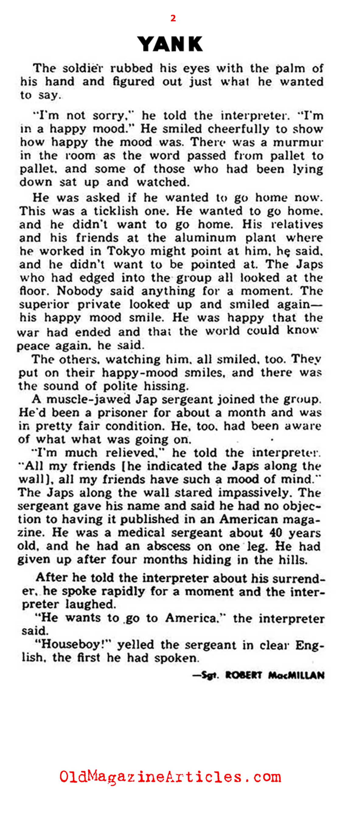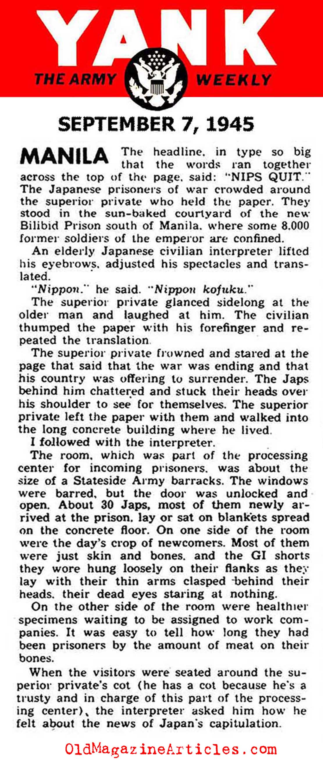 This is a short column by an eye-witness in Manila who clearly described the profound sense of melancholy that descended upon the W.W. II Japanese prisoners of war when they were told of the Japanese surrender.