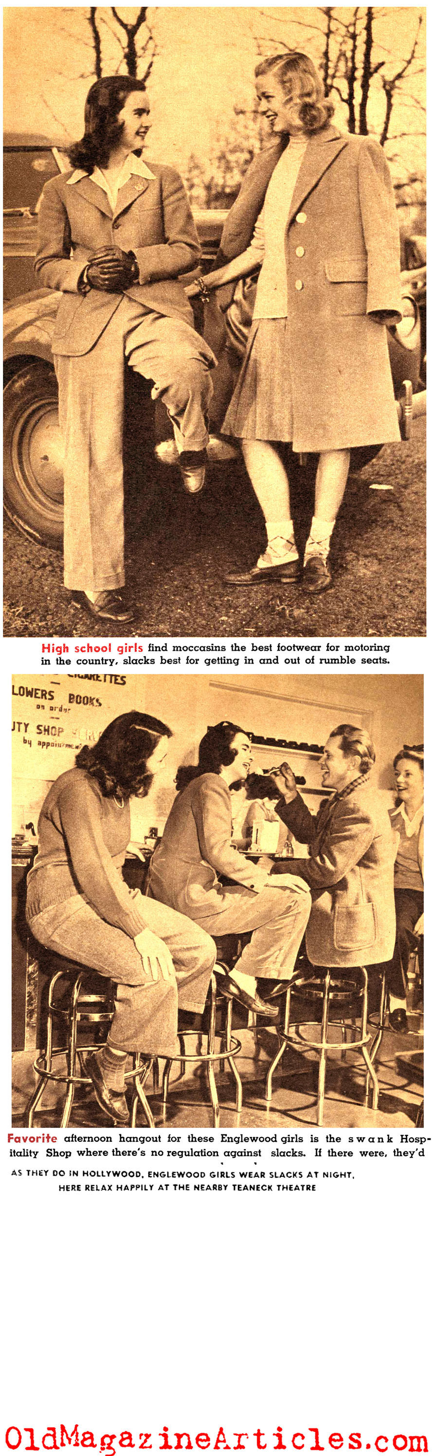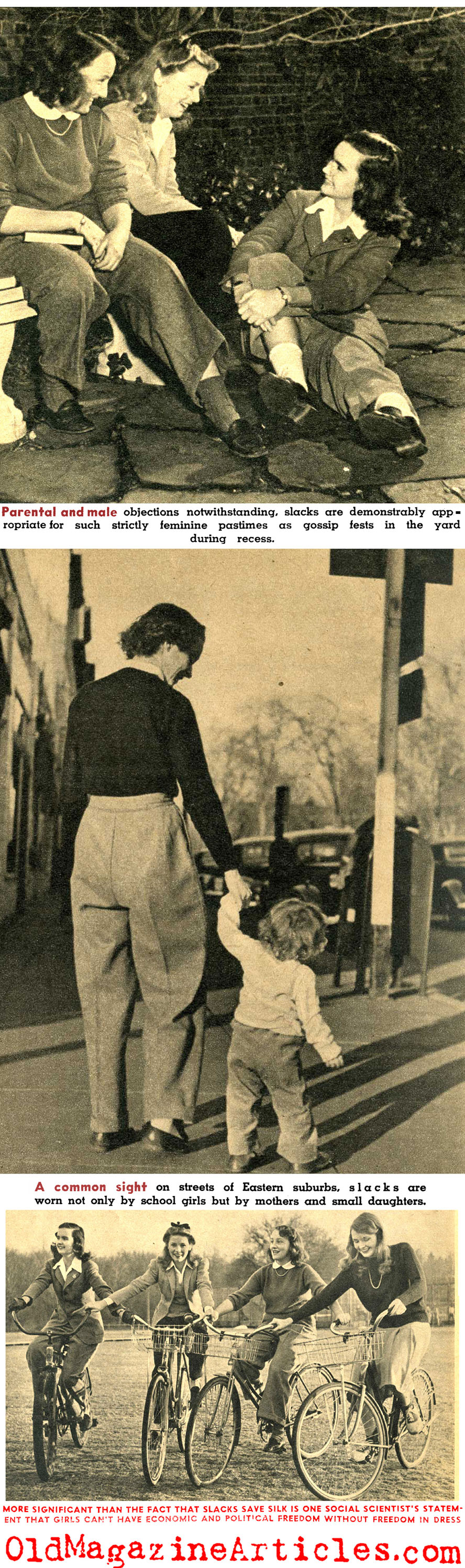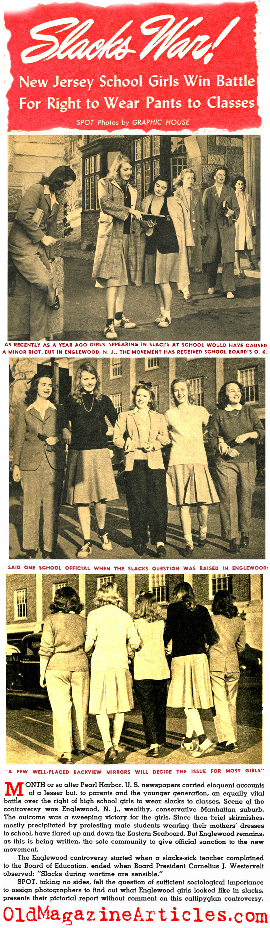 The battle over pants for women had been going on long before this article came to press. Keeping in mind that women had been wearing pants throughout all of Asia and the Middle East, and just twenty years earlier women of the West found that pants proved quite useful for factory work during the First World War. Film actresses Marlene Dietrich and Kate Hepburn made them quite popular throughout the Thirties. By 1942 pants for women became a real no-brainer and those who fought them (and there were many) were seen as eccentric. They were once again needed for feminine factory drones and the U.S. military didn’t think twice about issuing them to the WAACs, WAVES and WASPs. This article tells of a New Jersey high school that resisted the popular fashion all the way to the very top of the hierarchy, where it was finally declared by the school board president that “Slacks during wartime are sensible.”